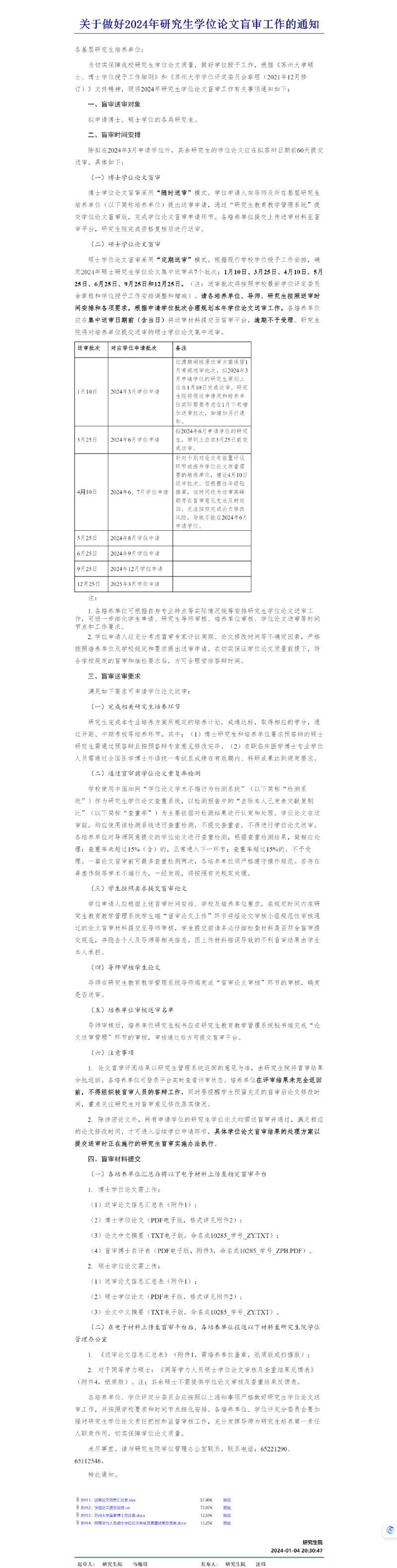 根据《禁漫天堂 硕士、博士学位授予工作细则》(苏大学位〔2012〕20号)、《禁漫天堂 硕士、博士学位论文盲审实施办法》(苏大研〔2024〕4号)以及《禁漫天堂 关于进一步加强研究生学位论文质量全过程管理的意见》(苏大研〔2020〕115号)等文件精神,2024年学位论文盲审工作即将开始,请2024年答辩的研究生做好相关工作。