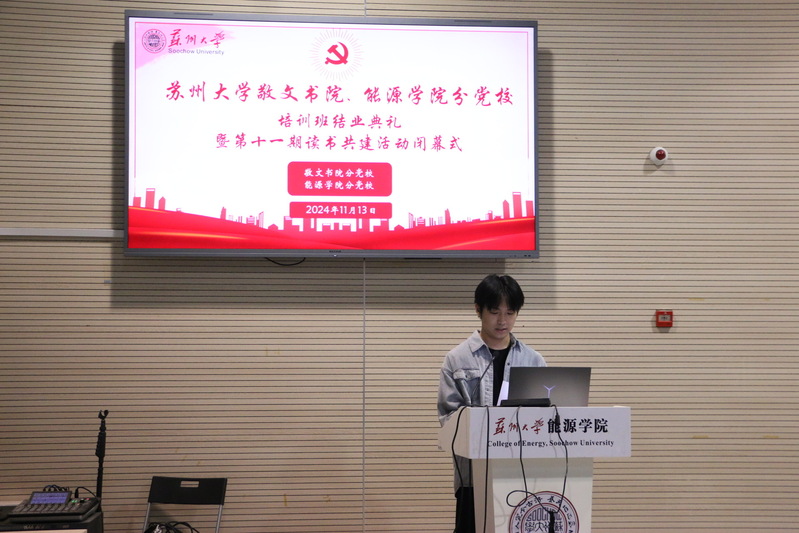 根据会议议程,敬文书院分党校学生工作组织理事长赵宸从组织概况、组织架构、工作内容、未来展望、特别鸣谢五个方面对本期分党校工作组织建设的整体情况与学员过程化教育的成果进行详细阐述,并对两院党委的亲切关怀和分党校指导老师的悉心指导及全体同学的积极参与表示感谢。