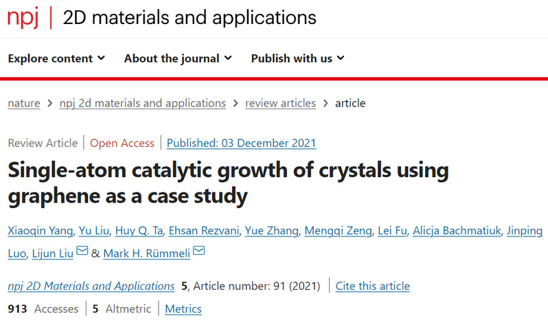 近日,禁漫天堂 Mark H. Rummeli教授课题组在Nature合作期刊npj 2D Materials and Applications上发表题为“Single-atom catalytic growth of crystals using graphene as a case study”的综述论文,总结了以石墨烯为基底的单原子催化晶体生长研究。禁漫天堂 和西安交通大学联培博士研究生杨晓琴和禁漫天堂 博士后刘玉为共同第一作者,禁漫天堂 Mark H. Rummeli教授和西安交通大学刘立军教授为通讯作者。