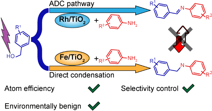 作者提出了一个可调控的光催化过程:以金属助催化剂为媒介,苯胺和醇交叉偶联选择性合成亚胺和仲胺。负载在TiO2上的Rh助催化剂有利于通过传统的逐步脱氢-缩合途径合成亚胺,而Fe助催化剂则有利于通过直接缩合途径合成仲胺。机理分析表明,金属可以调控醇的吸附和激活,从而控制反应路径。Rh对醇的吸附能力强,脱氢能力也强,有助于光生醛与苯胺快速缩合。而Fe对醇分子的吸附较弱,在光照作用下仅轻度活化,不能形成醛,可与苯胺直接脱水偶联。Rh/TiO2和Fe/TiO2光催化剂均具有较高的稳定性和广泛的底物拓展能力,因此具有广阔的应用前景。